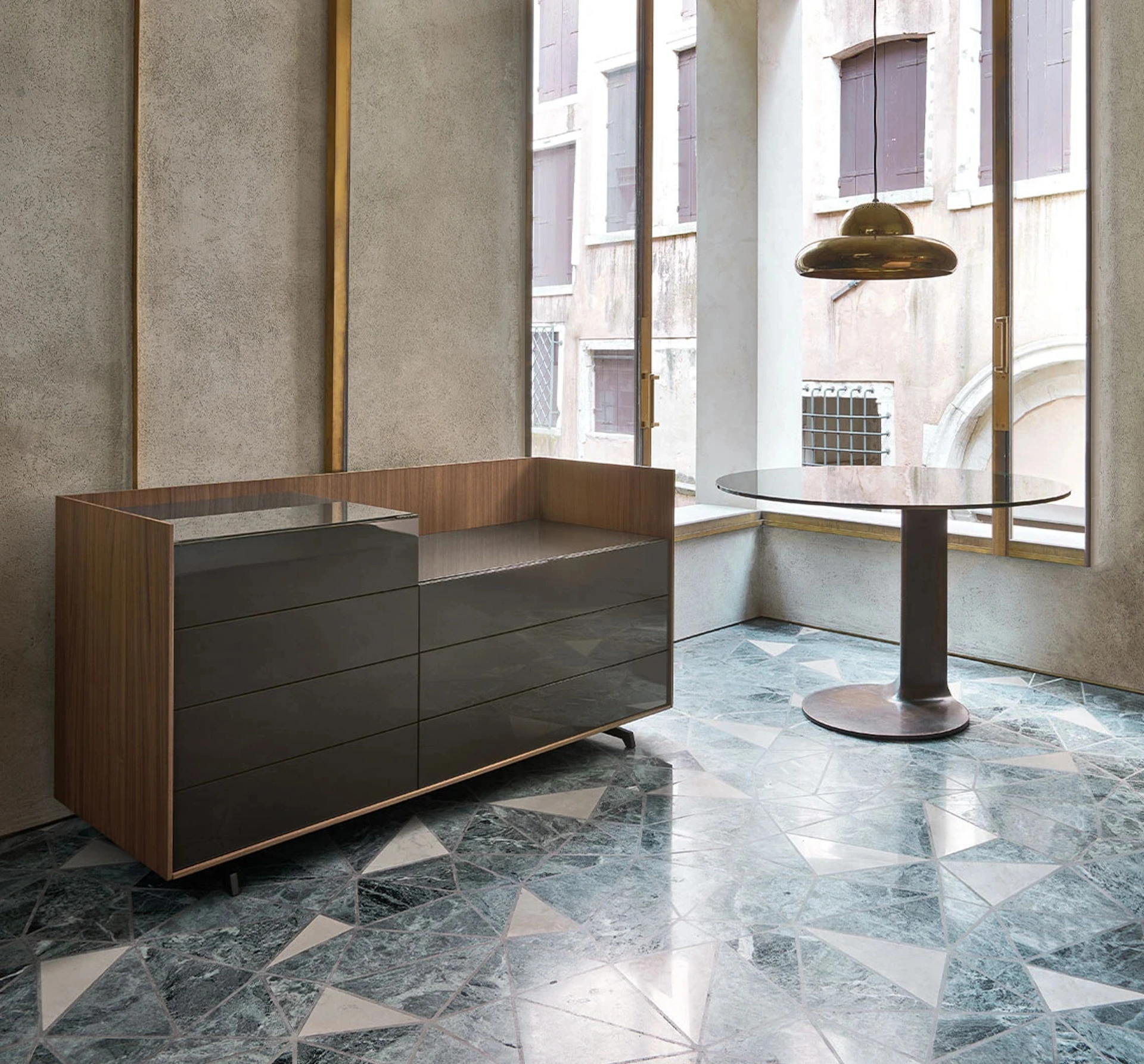 Un ricco catalogo di mobili con cassetti Sangiacomo: i comodini design in laccato lucido, come Cabaret Glass Comò, sono tra le soluzioni più originali.