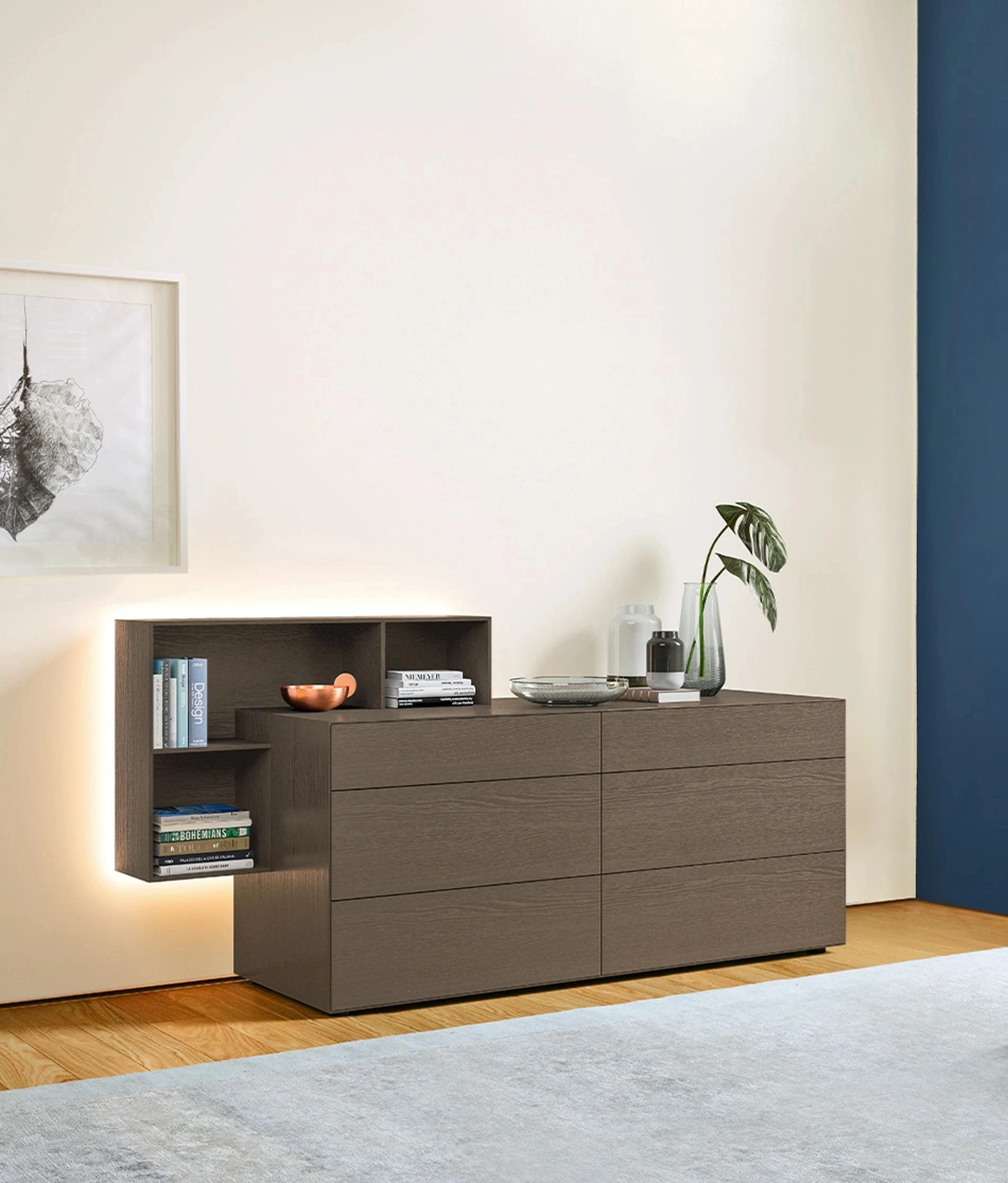 I Comodini sono arredamenti capaci di ultimare la zona notte assicurando un'area di appoggio certamente utile e poliedrico. Ti chiedi come abbinare letti, armadi e comò? Con il modello di Sangiacomo visibile in foto avrai un mobile adatto a uno spazio dai richiami design.