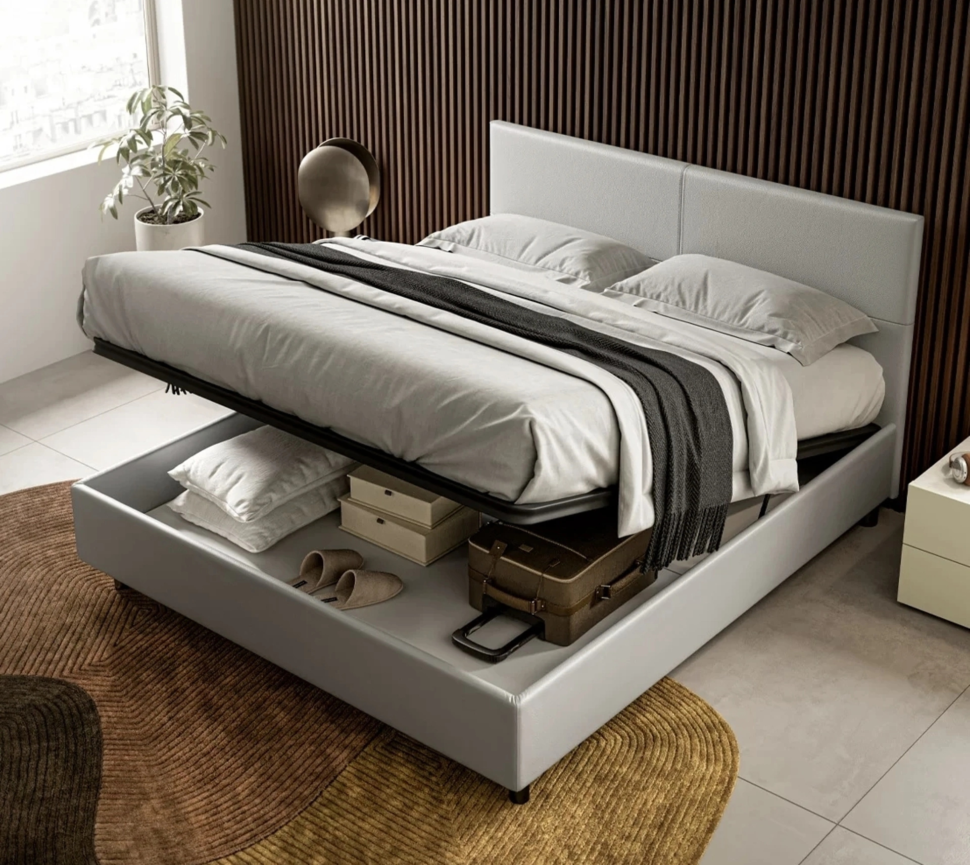 Il letto Bora in ecopelle, tra i modelli con contenitore matrimoniali moderni di SantaLucia, è ideale per assicurarti il relax totale.