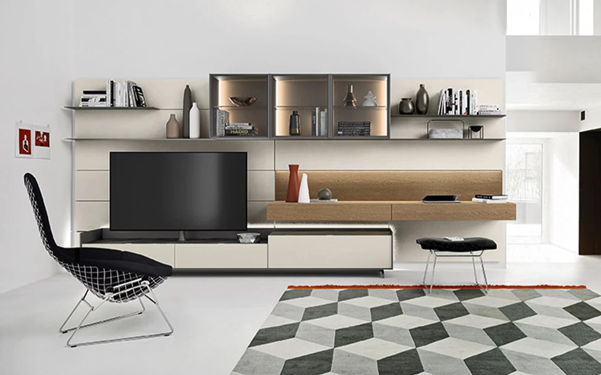 Vuoi allestire un soggiorno operativo e pratico? Ecco a te la parete attrezzata Cabaret Step Sangiacomo dalle forme decise moderne.
