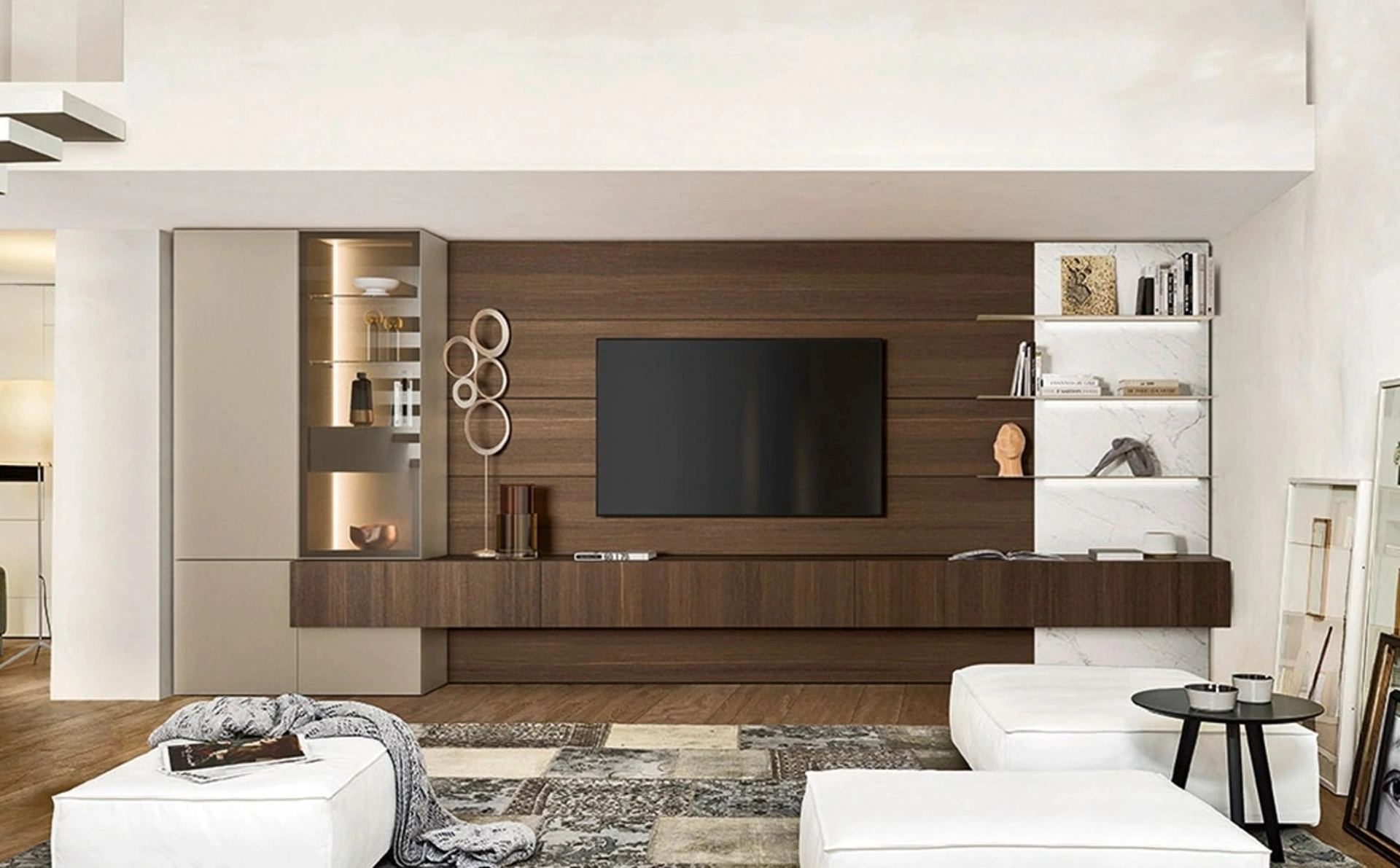 Se vuoi completare un soggiorno dinamico e operativo dalle linee moderne, ti presentiamo la parete attrezzata Lampo 004 Sangiacomo.