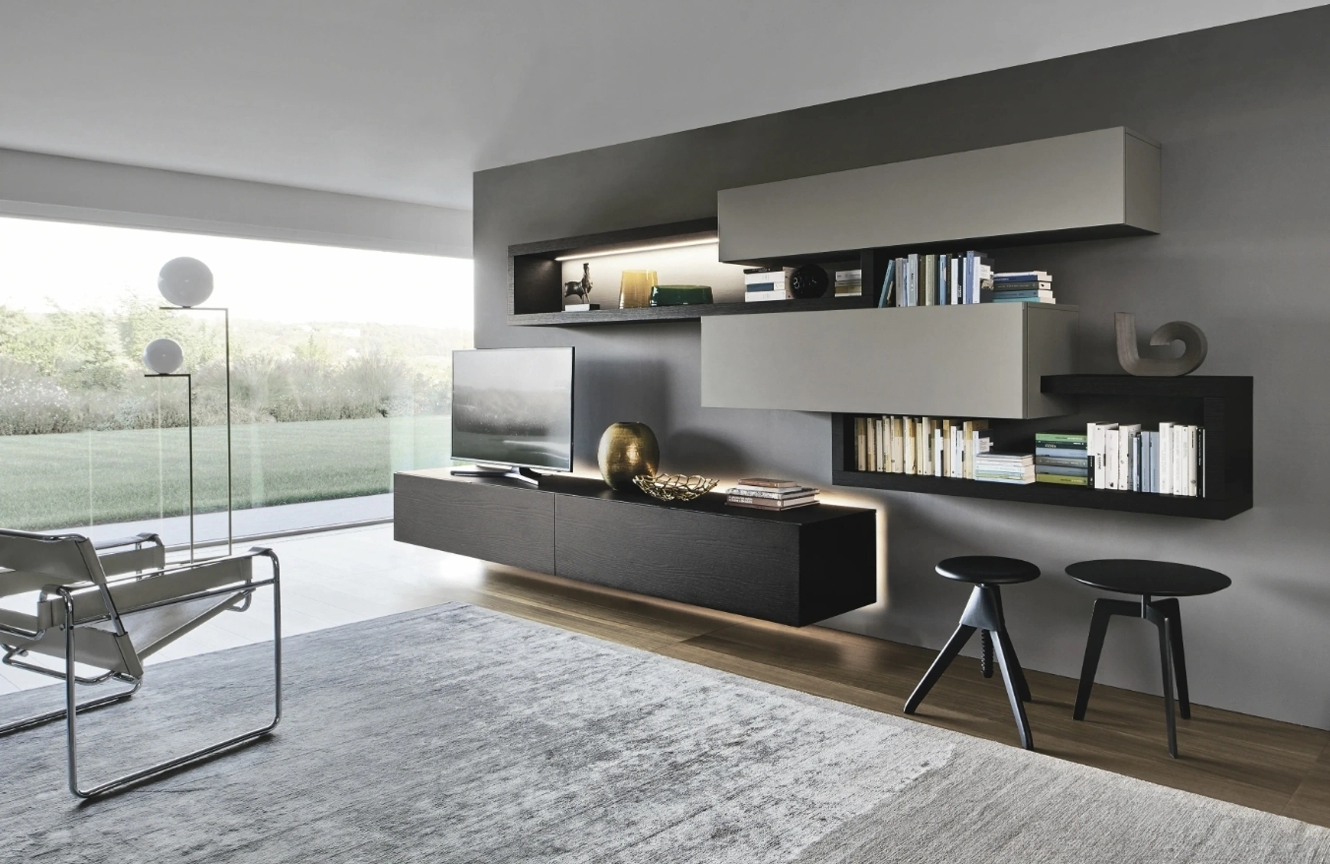 Vuoi progettare un living pratico e dinamico? Ti presentiamo la parete attrezzata Lampo 046 Sangiacomo dalle linee decise moderne.
