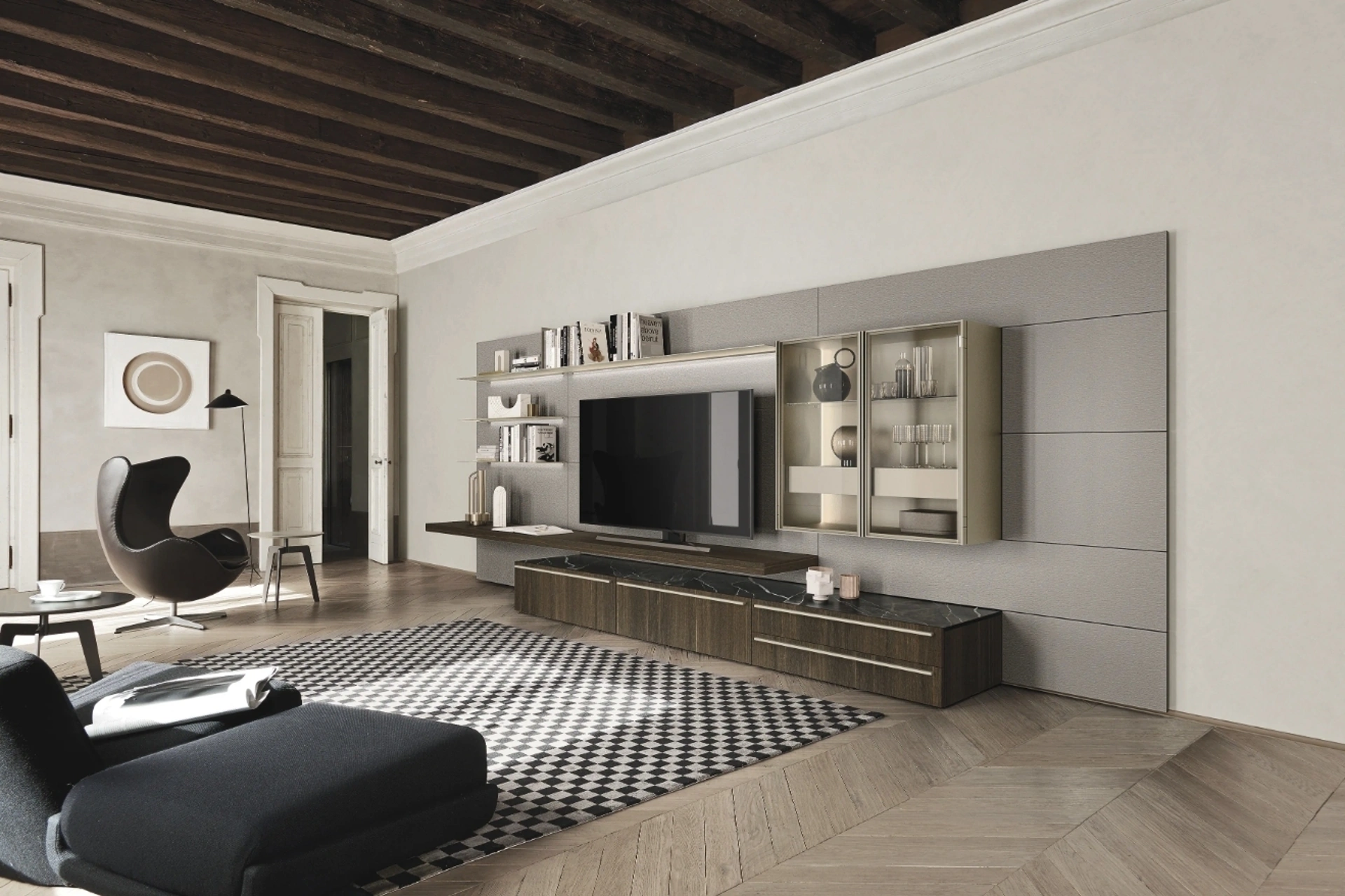 Vuoi ammobiliare un living operativo e pratico? Ecco a te la parete attrezzata Lampo 198 Sangiacomo dalle forme decise moderne.