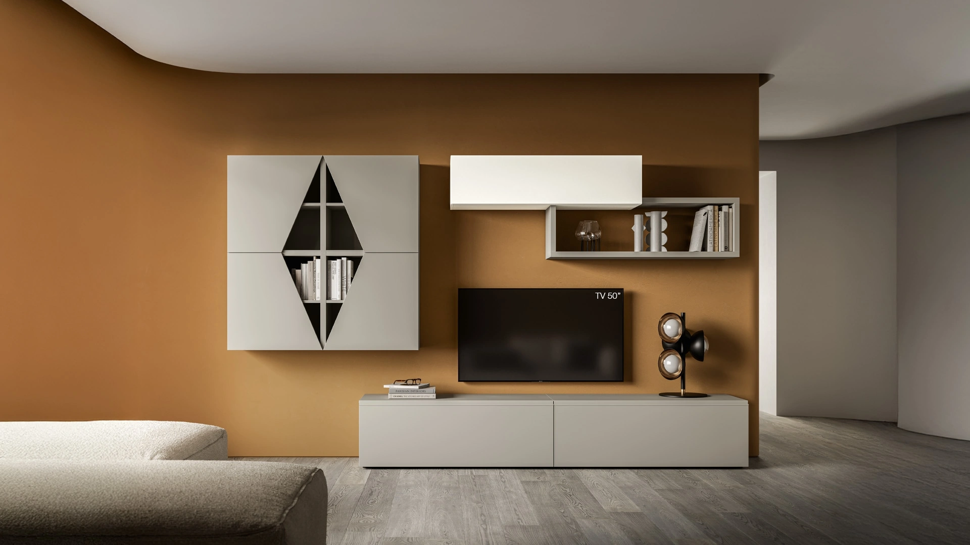 Vuoi progettare un soggiorno pratico e dinamico? Ti presentiamo la parete attrezzata Pratico PTG422 SantaLucia dalle linee decise moderne.